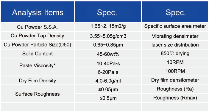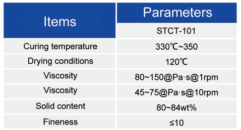 c. STCT-301 is a copper paste suitable for small size (0201 size and below) NP0 series MLCC terminal electrode; d. STCT-302 is a copper paste suitable for medium and large size (0402 size and above) X and NP0 series MLCC terminal electrode.